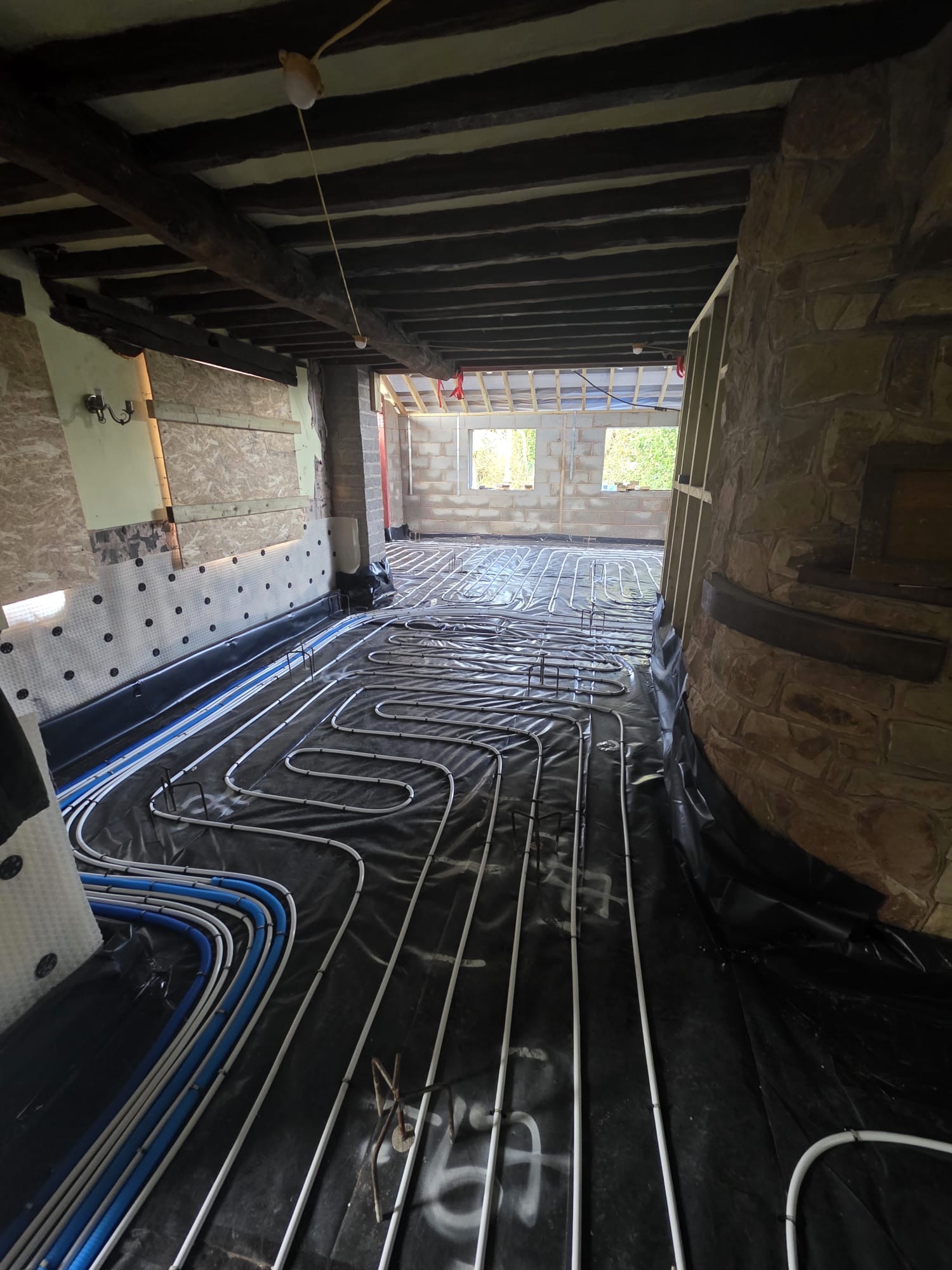 Underfloor heating works by warming a large surface area at a lower temperature, rather than heating a small radiator to a high one. In a well-insulated building, this is significantly more efficient. It also produces a gentler, more consistent background warmth – less fluctuation, fewer cold spots, and a more comfortable home overall.