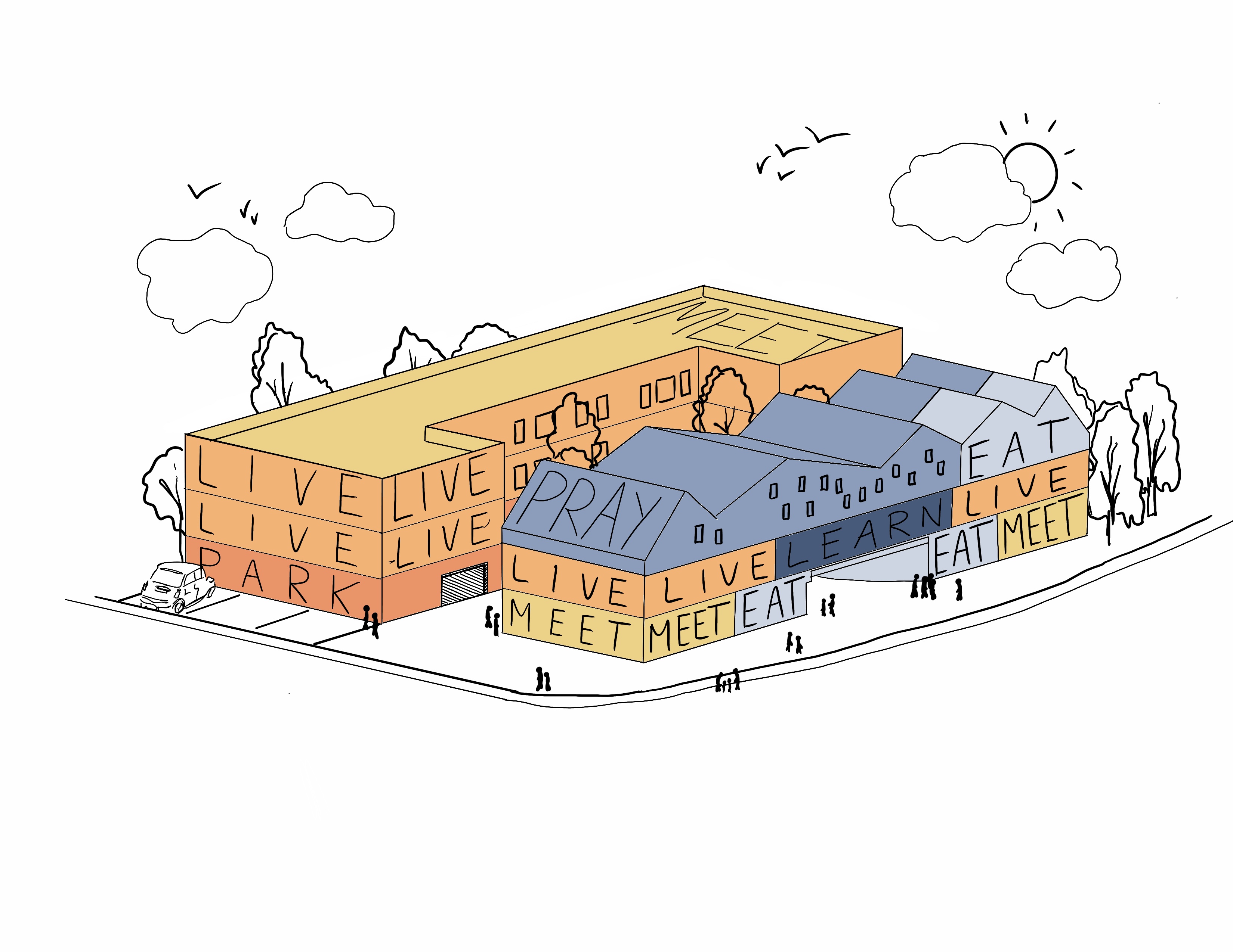 At ground level, practical requirements such as parking are balanced with active communal spaces for meeting and eating. The upper floors introduce residential accommodation alongside areas for worship and shared use, creating a layered arrangement of LIVE, EAT, and PRAY functions.